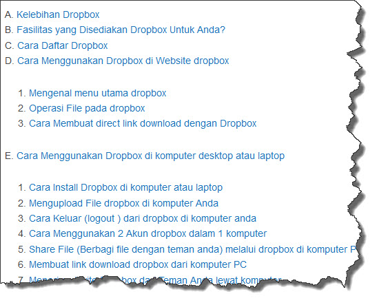 Saya anggap anda sudah memahami tentang apa itu link dan bagaimana cara membuat link, selanjutnya adalah kita akan coba membuat link untuk daftar isi artikel anda yang sangat panjang.