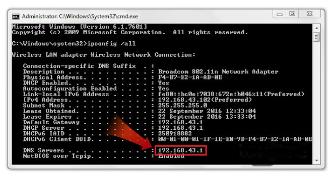 Scroll kebawah sehingga kamu akan menemukan angka DNS Server, ingat atau catat angka tersebut untuk kita ping koneksinya.