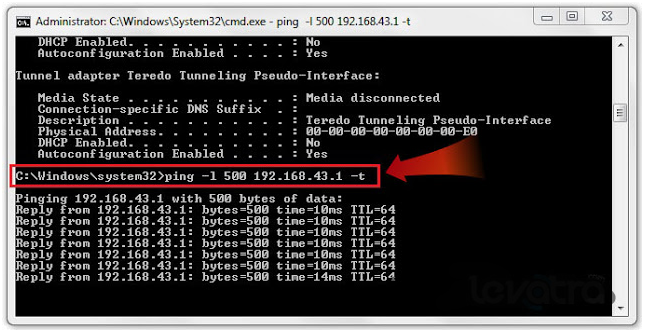 Ketik “ping -l 500 192.168.43.1 -t” (tanpa tanda petik)