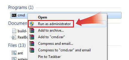 Buka Command Prompt (CMD), dengan cara klik START > pada kotak pencarian ketik kata kunci “CMD” > kemudian akan muncul program tersebut, lanjut klik kanan pada CMD lalu klik Run as Administration.