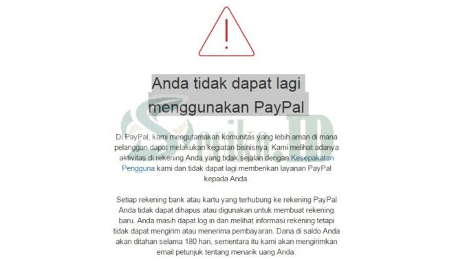 Dari pemberitahuan tersebut terlihat bahwa saya tidak mengikuti kebijakan peraturan pengguna paypal yang telah ditetapkan. Dan saldo saya yang ber isikan 200.000 tersebut di tahan selama 180 hari, atau sekitar 6 bulan lama nya. Waduh saya langsung kaget mendengar nya. Ketika saya membaca peraturan pengguna paypal, bahwa akun paypal yang baru dibuat tidak diperbolehkan mengisi saldo lebih dari 100.000 karena akan membuat pihak paypal curiga ada kegiatan yang di lakukan oleh pengguna nya di luar peraturan kebijakan paypal.