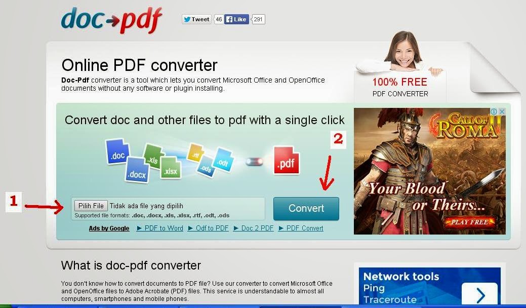 http://www.doc-pdf.net/ - Cara menggunakanya cukup mudah, anda cukup upload file Word dengan mengklik Pilih File seperti yang ditunjuk pada nomor 1 (pada gambar dibawah) lalu tekan Convert.