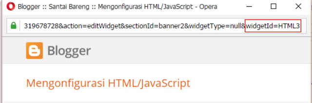 Klik bagian petunjuk yang ditandai dengan lingkaran warna biru di atas, setelah itu Anda akan mendapatkan kode widget yang Anda pilih tadi, contohnya seperti di bawah ini.<b:widget id=’HTML3′ locked=’false’ title=” type=’HTML’ visible=’true’<b:includable id=’main’><!– only display title if it’s non-empty –><b:if cond=’data:title != ""’><h2 class=’title’><data:title/></h2></b:if><div class=’widget-content’><data:content/></div><b:include name=’quickedit’/></b:includable></b:widget>