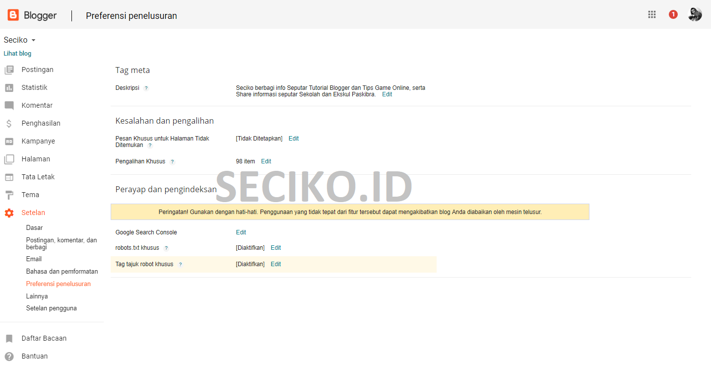 - Klik ‘Setelan’ pada Dashboard Blogspot, dan klik ‘Preferensi Penelusuran’. Lalu klik ‘Pengalihan Khusus’.