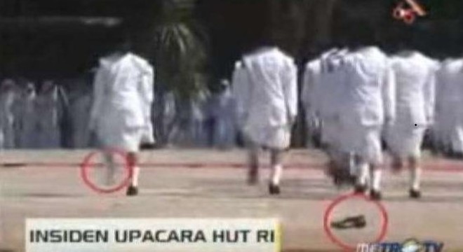 Kejadian ini terjadi pada saat Proses Pengibaran Bendera Merah Putih di Istana Negara, salah satu Paskibraka hampir saja jatuh karena menginjak kakinya sendiri.
