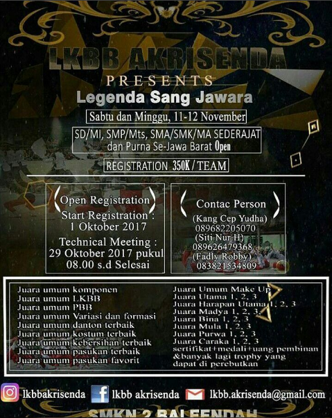 Selamat sore Akang/Teteh semua, kali ini saya akan kembali share info lomba Paskibra di daerah Bandung. Tepatnya di SMKN 2 Baleendah. Lomba ini akan dilaksanakan pada pertengahan Bulan November, tepatnya pada tanggal 11-12 November 2017. Untuk detail informasi lebih lengkapnya silahkan cek di bawah ini ya…