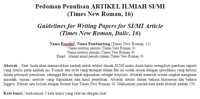 Judul artikel ilmiah ditulis menggunakan huruf Times New Roman dengan font-size 16. Jika judul mengandung bahasa asing, maka harus dicetak miring.