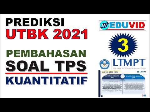 | Pembahasan prediksi soal TPS Kuantitatif (Matematika Dasar) UTBK 2020 berbahasa Inggris. Kisi-kisi Soal UTBK 2021 LTMPT. Trik cepat cara menjawab soal tps kuantitatif utbk 2021. ———————————————————— ➡️Yuk traktir Bang EduVid ngopi☕ ⏩Disini 👉 🔌Biar tambah semangat 💪 ———————————————————— Materi UTBK 2021 Tes Potensi Skolastik (TPS): TPS mengukur KEMAMPUAN KOGNITIF yang dianggap penting untuk keberhasilan di sekolah formal, khususnya pendidikan tinggi. DalamTPS yang akan diuji adalah KEMAMPUAN PENALARAN UMUM, KEMAMPUAN KUANTITATIF, PENGETAHUAN DAN PEMAHAMAN UMUM, sertaKEMAMPUAN MEMAHAMI BACAAN DAN MENULIS. Kemampuan kuantitatif akan mencakup Pengetahuandan Penguasaaan Matematika Dasar. PadaTPS, sebagian soal disajikan dalam Bahasa Inggris Tes Kemampuan Akademik (TKA): Mengukur PENGETAHUAN dan PEMAHAMAN KEILMUAN yang diajarkan di sekolah dan diperlukan untuk seseorang dapat berhasil dalam menempuh pendidikan tinggi. TKA juga mengukur kemampuan kognitif yang terkait langsung dengan konten mata pelajaran yang dipelajari di sekolah. Penekanan tes adalah pada Higher Order Thinking Skills (HOTS). === Persiapan UTBK 2021 Prediksi Soal UTBK 2021 | |