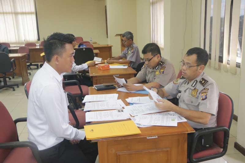 - Adapun berkas-berkas yang akan diperiksa. Pertama, surat permohonan dengan syarat surat permohoman tersebut harus ditulis sendiri oleh pendaftar dengan tinta berwarna hitam tanpa adanya coretan ataupun ada yang dihapus di atas kertas bergaris agar terlihat rapi serta menggunakan materai 6000 Rupiah. Kedua, foto copy akte kelahiran yang dikeluarkan oleh pihak walikota atau bupati, jika tidak memiliki akte kelahiran, maka dapat menggunakan surat keterangan kelahiran yang juga dikeluarkan oleh pihak walikota atau bupati, dan jika terdapat kesalahan pada akte kelahiran maka pendaftar harus melampirkan surat keterangan yang dikeluarkan oleh yang berwenang. Ketiga, foto copy ijazah mulai dari SD hingga ijazah SMA bagi lulusan tahun ini yang belum memiliki ijazah diharuskan mengumpul nilai semester 5. Keempat, foto copy surat keterangan sehat yang dikeluarkan oleh instansi kesehatan pemerintah kecuali polri. Kelima, Surat Keterangan Catatan Kepolisian sebagai bukti bahwa pendaftar tidak pernah melakukan tindakan criminal. Keenam, foto copy kartu keluarga dan foto copy KTP.Ketujuh, surat pernyataan mendapat persetujuan dari orang tua. Kedelapan, surat pernyataan belum menikah. Kesembilan, daftar riwayat hidup. Kesepuluh, surat perjanjian ikatan dinas pertama (IDP) anggota polri dan surat pernyataan tidak terikat pada suatu instansi atau perusahaan.