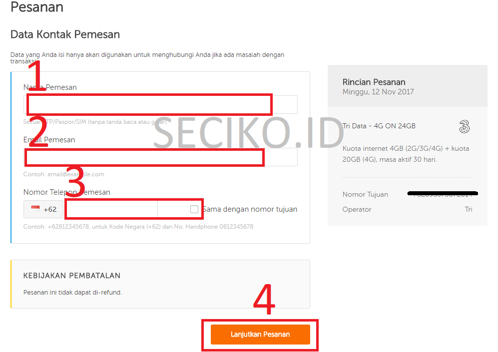 5. Selanjutnya isi Data Kontak Pemesan, lalu klik tombol ‘Lanjutkan Pemesanan’