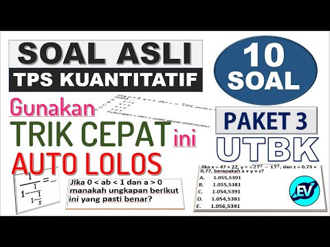 | Pembahasan Kumpulan Soal Asli TPS Penalaran Kuantitatif/ Numerik (Penalaran Umum) Tahun-tahun sebelumnya untuk persiapan tes/ujian UTBK SBMPTN 2021. Prediksi TPS UTBK 2021, Kisi-kisi Soal UTBK 2021 LTMPT. Trik cepat cara menjawab soal tps kuantitatif utbk 2021. ———————————————————— ➡️Yuk traktir Bang EduVid ngopi☕ donk… ⏩Disini 👉 🔌Biar tambah semangat 💪 ———————————————————— TRIK SUPER CEPAT PERTIDAKSAMAAN (Menentukan tanda positif negatif pada garis bilangan): 👉 U TRIK CEPAT Pertidaksamaan Nilai Mutlak: 👉 4 Kumpulan Soal UTBK 2021: 👉 /> Download Soal Asli UTBK SBMPTN PAKET 2: 👉Bentar lagi disiapin ya (akan update selanjutnya) Download Soal Asli UTBK SBMPTN PAKET 2: 👉 l Download Soal Asli UTBK SBMPTN PAKET 3: 👉sebentar lagi ya Materi UTBK 2021 Tes Potensi Skolastik (TPS): TPS mengukur KEMAMPUAN KOGNITIF yang dianggap penting untuk keberhasilan di sekolah formal, khususnya pendidikan tinggi. DalamTPS yang akan diuji adalah KEMAMPUAN PENALARAN UMUM, KEMAMPUAN KUANTITATIF, PENGETAHUAN DAN PEMAHAMAN UMUM, serta KEMAMPUAN MEMAHAMI BACAAN DAN MENULIS. Kemampuan kuantitatif akan mencakup Pengetahuan dan Penguasaaan Matematika Dasar. PadaTPS, sebagian soal disajikan dalam Bahasa Inggris. Tes Kemampuan Akademik (TKA): Mengukur PENGETAHUAN dan PEMAHAMAN KEILMUAN yang diajarkan di sekolah dan diperlukan untuk seseorang dapat berhasil dalam menempuh pendidikan tinggi. TKA juga mengukur kemampuan kognitif yang terkait langsung dengan konten mata pelajaran yang dipelajari di sekolah. Penekanan tes adalah pada Higher Order Thinking Skills (HOTS). === Persiapan UTBK 2021 Prediksi Soal UTBK 2021 | |
