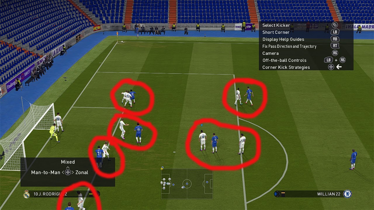 Dibutuhkan ketenangan saat mengambil ancang-ancang agar bisa berbuah gol. Nah bagusnya PES 2017 ini, dia sudah dilengkapi beberapa fitur ancang-ancang. Yang saya maksud di sini adalah ancang-ancang pemain yang berada di dalam kotak pinalti, bukan pemain yang akan menendang bola. Jika kita menggunakan Joystik bisa pencet tombol Arah Kiri (bukan analog) lalu muncul pilihan bagaimana skenario yang kita inginkan saat bola melambung nanti. Ada 4 fitur seperti Far post, Trainer, Dash, dan 6-Yard Box. Ada yang harus kita perhatikan jika Corner di sebelah kanan, kita pakai pemain yang menendang dengan kaki kanan seperti Kroos. Sebaliknya jika Corner di sebelah kiri, kita pakai pemain kidal seperti Bale.