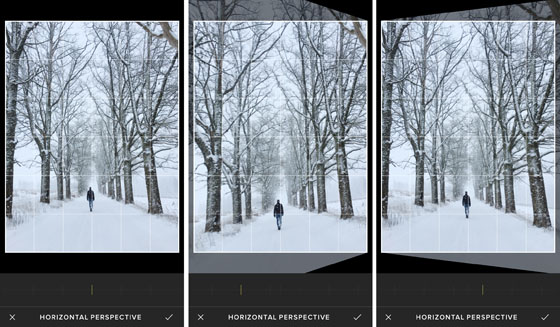 Skews gambar Anda untuk memperbaiki masalah dengan perspektif vertikal dan alignment. Seret kanan geser untuk merentangkan tepi atas foto, atau seret ke kiri untuk meregangkan tepi bawah gambar.