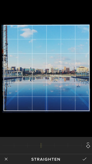 Memungkinkan Anda untuk meluruskan garis horizontal pada foto Anda menggunakan slider. Alat ini bagus untuk meluruskan cakrawala dalam foto landscape. Ikon kotak di sebelah kanan panel geser memungkinkan Anda memutar gambar 90 derajat sekaligus.