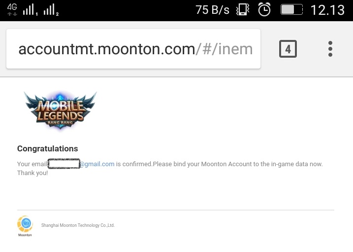 Setelah menekan tombol submit kamu harus melakukan verifikasi akun, dan bisa memerikanya pada email yang sudah kamu daftarkan di atas. Dalam email klik saja alamat / url yang tersedia atau yang sudah dikirim, maka kamu akan mendapati tampilan browser seperti di bawah ini setelah akun kamu terverifikasi. Yang menandakan email kamu sudah terdaftar pada Akun Moonton.