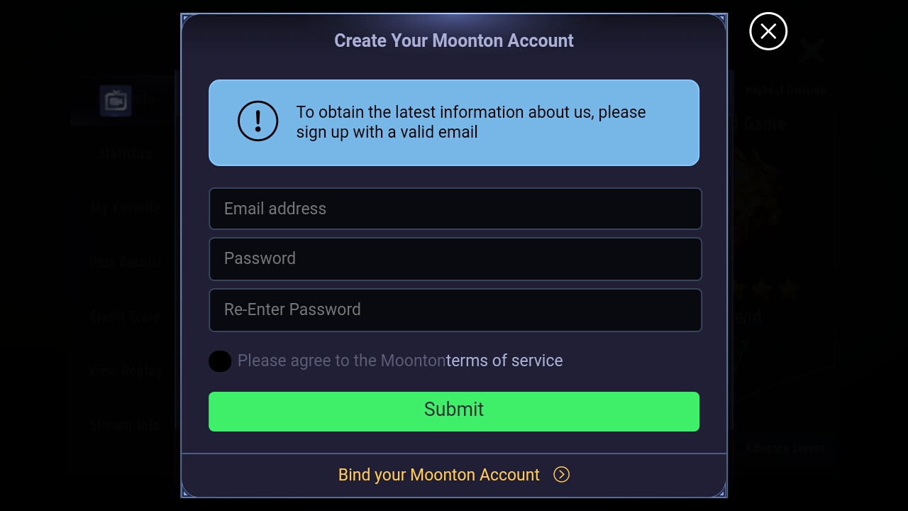 Setelah masuk ke tampilan pendaftaran di sini kamu akan mengisi email yang aktif, dan sementara jangan gunakan email yang memiliki tanda titik “.” karena masih terjadi beberapa kesalahan dalam pengoreksian format email yang akan kami perbaiki secepat mungkin di pembaharuan selanjutnya. Masukkan pasword yang terdiri dari kombinasi huruf besar kecil dan angka minimal 8 huruf, jika lebih juga bagus namun usahakan rumit dan tidak bisa ditebak dengan mudah, jangan gunakan password seperti Qwerty123, dsb. Masukkan kembali password yang sama dengan kolom input kedua untuk mengetes daya ingat kamu. Kemudian klik centang / checklist pada kotak kecil untuk menyetujui segala aturan dan larangan yang berlaku, jika kamu penasaran kamu bisa mengeklik Terms of Service. Terakhir klik sumbit untuk melakukan pendaftaran.Jika kamu sudah pernah melakukan pendaftaran sebelumnya dan terhenti, dan kamu sudah menerima email konfirmasi kamu bisa klik Kaitkan Akun Monton kamu (Bind your Moonton Account).