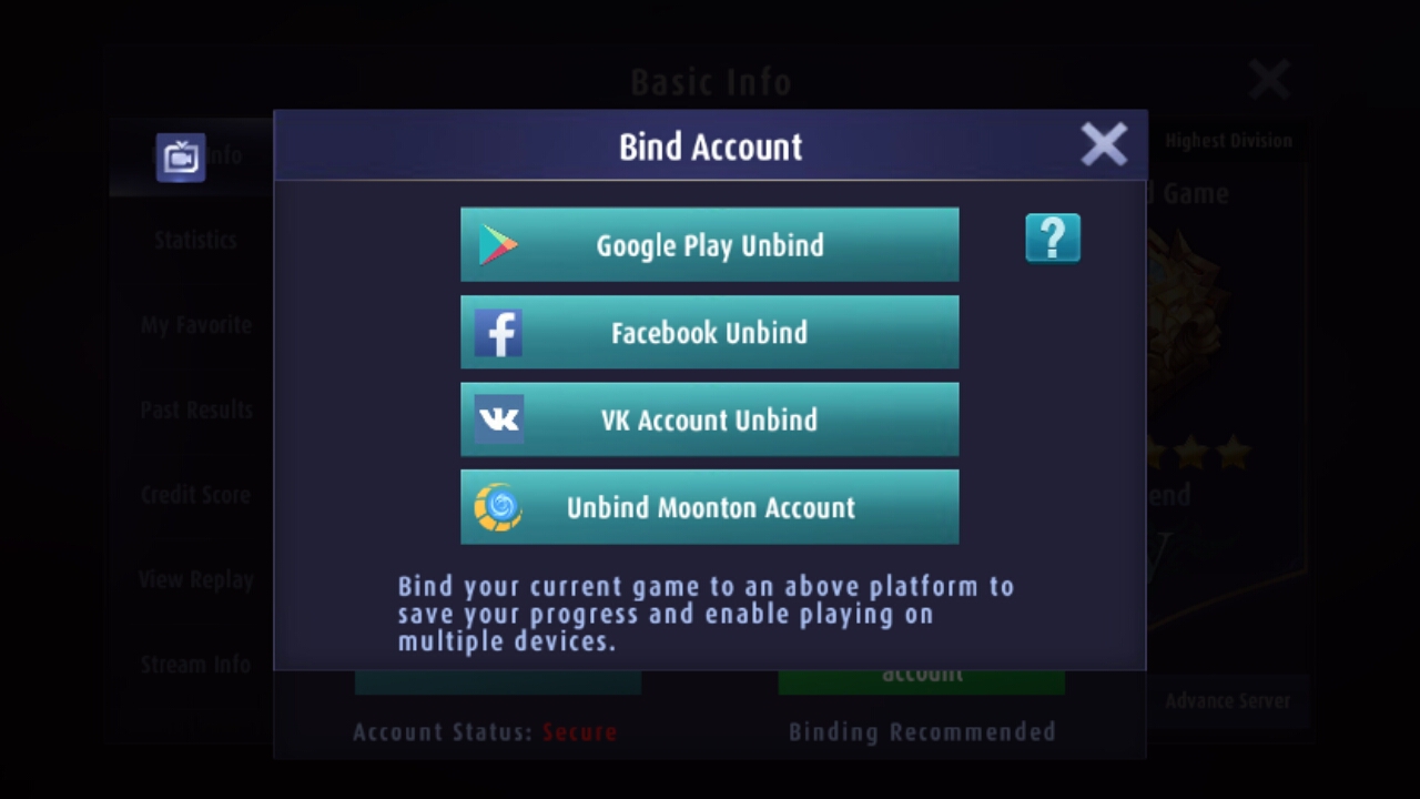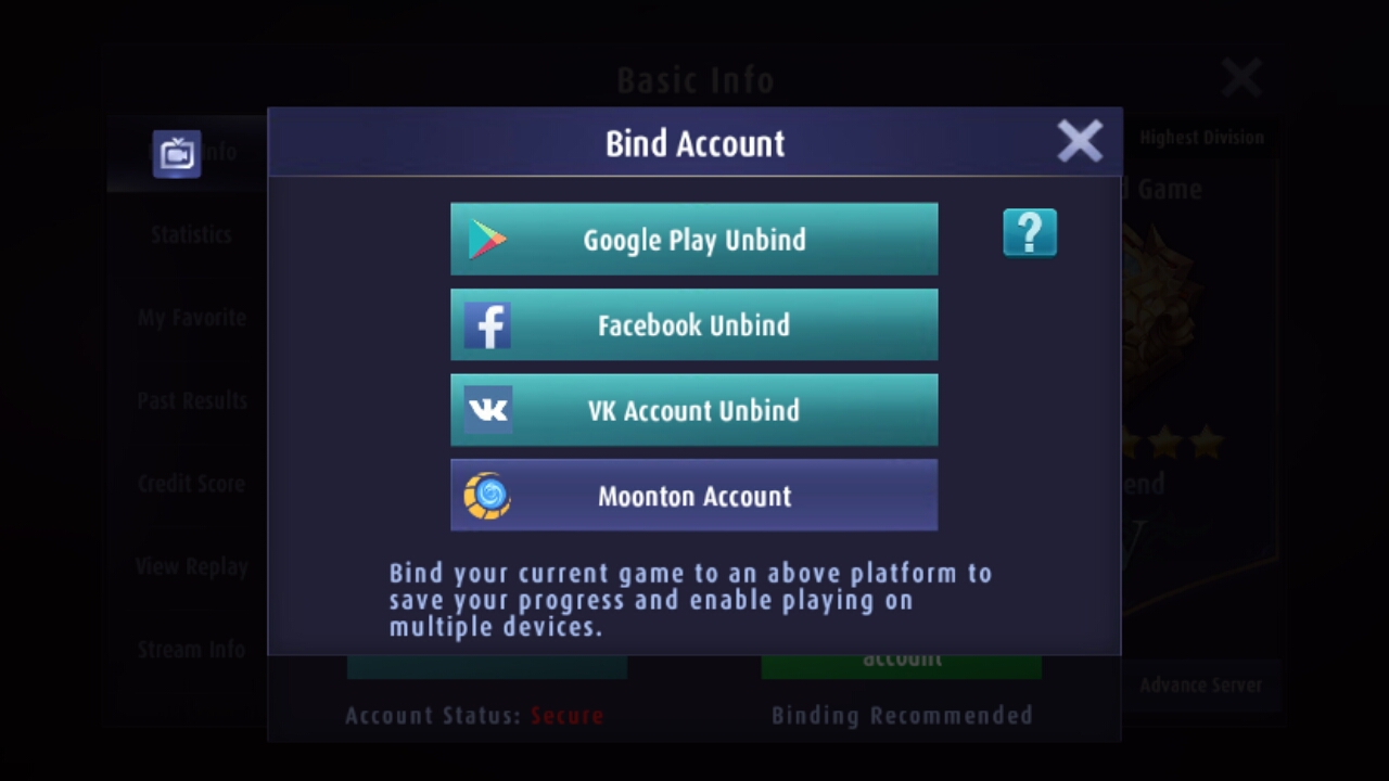 Bind akun sangat diperlukan ya guys demi keamanan akun ketika kamu ingin berganti dari satu akun ke akun lainnya, dan sebaiknya kamu bind ke semua akun media sosial kamu dari FB / VK / Google / Moonton untuk mengantisipasi terjadinya lupa bind ketika berganti akun yang mana ini dijadikan alasan ketika mereka kehilangan akun mereka, padahal sebelum melalukan pergantian akun saat keadaan belum di bind akan ada peringatan bahwa akun tidak akan tersimpian namun mereka tidak memperdulkan dan langsung mengklik OK / Yes saja, nah untuk itu jangan lupa untuk budayakan membaya terlebih dahulu yah.