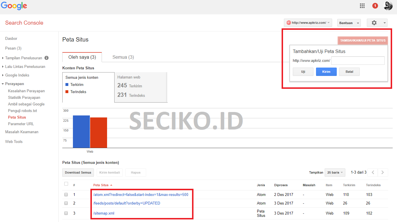 atom.xml?redirect=false&start-index=1&max-results=500 - Masukan URL tersebut dan klik kirim. Lakukan sebanyak 3 kali dengan masing-masing URL yang saya berikan di atas. Atau jika ingin memasukkan salah satu pun tidak masalah.
